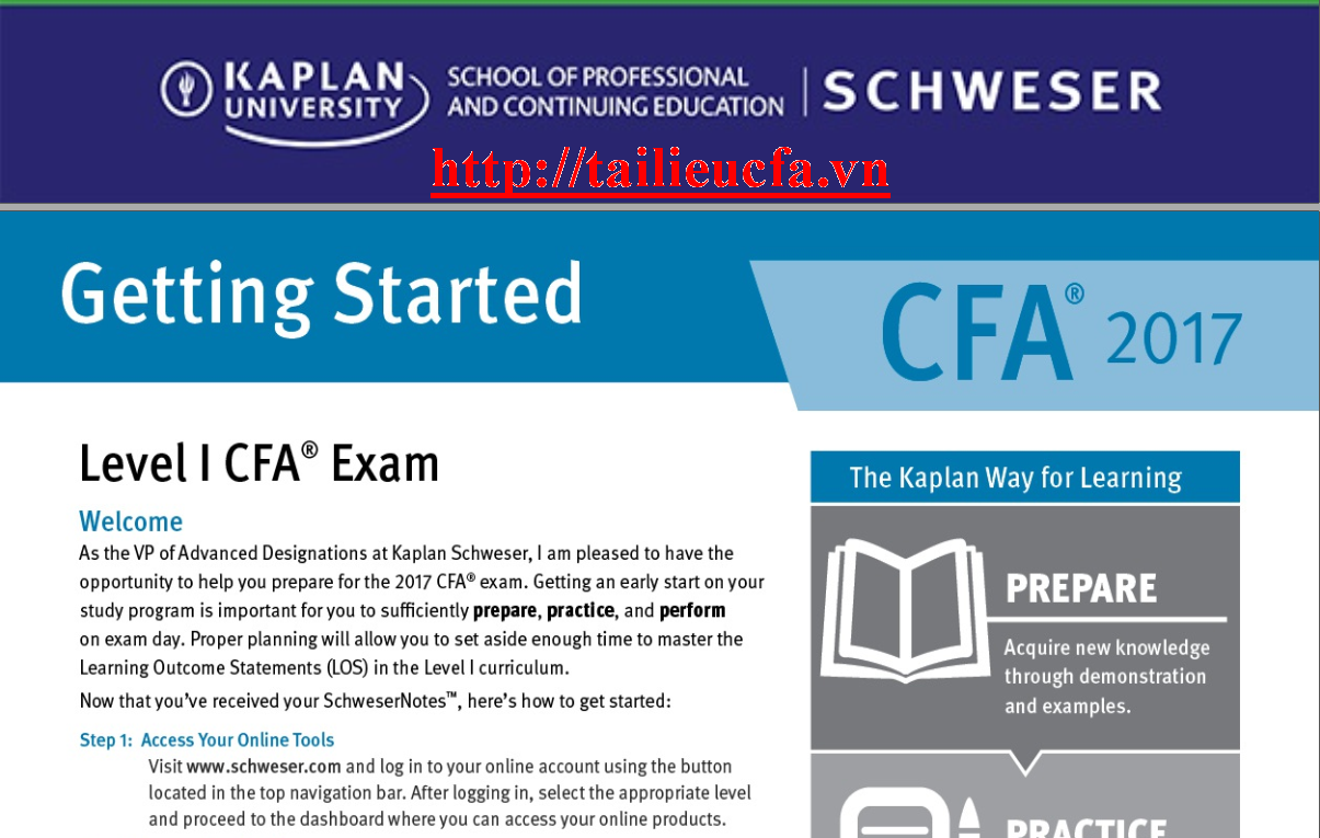 Lời khuyên cho các bạn là nên đọc từ CFA Kaplan SchweserNotes. Kiến thức của bộ tài liệu này được tổng hợp lại, khá súc tích dễ hiểu. Bộ tài liệu Kaplan Schweser phù hợp với các bạn có ít thời gian và đã có background về tài chính đầu tư.